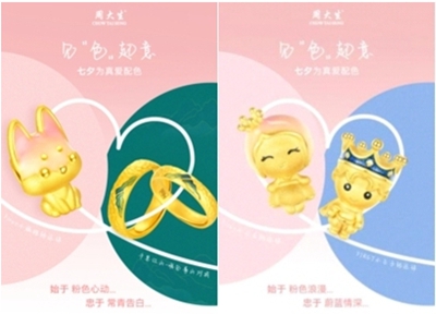 今年七夕,周大生以“为真爱配色”为主题,结合FIRST系列产品的粉蓝色和千里江山系列产品的青绿色展开话题讨论。FIRST系列采用行业首创果冻珐琅工艺,推出萌宠乐园、浪漫童话系列打造丰富产品造型,成功打破黄金产品传统守旧的刻板印象,广受业内好评;国家宝藏的联名IP系列产品千里江山系列采用珐琅工艺,以青绿设色精心制造,是情侣必买产品~FIRST系列产品的粉蓝色代表恋爱初期时的美好心动,而千里江山的青绿色则代表了爱情稳定期的陪伴相守,两种有冲突的颜色与爱情观对比,引发大众对爱情的分享与讨论。