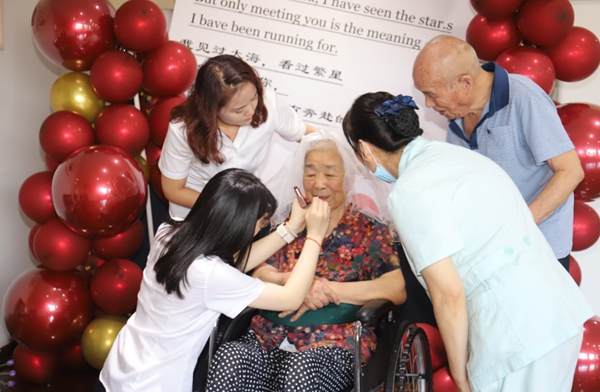 在寿山福海养老服务中心黄村院,工作人员们为奶奶们“圆梦”,许多奶奶都说她们这一生从未身披白纱,这一次我们为奶奶们精心装扮,披上白纱,拍下长辈们相守诉说的浪漫。