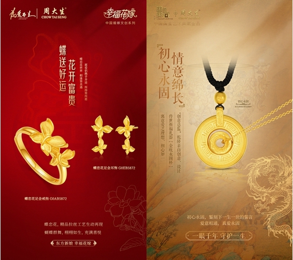 周大生珠宝在中秋国庆婚嫁季送出的多重好礼不仅彰显满满诚意,其主推的产品也十分应景。“花丝凤冠”作为幸福花嫁系列的最新设计,以凤冠为设计灵感,将古代象征着尊贵奢华的一方风情融入“花丝凤冠”中,彰显雍容华贵之美。花头下方与精美花丝交织缠绵,花丝虽小,却蕴含无穷巧思。周大生以花丝工艺为设计灵感,用现代珠宝工艺再现绵延千年的花丝形态,古今联结传承匠心独运。“幸福花冠”作为幸福花嫁系列的经典标志款,以婚嫁美好象征的凤冠造型为戒托,如中国新娘红妆大嫁的奢华凤冠,象征为爱加冕,荣宠一生的幸福。“蝶恋花”采用精品拉丝工艺再现群舞的蝴蝶,金光莹莹,蝶影翩翩,伴于爱人身侧,诠释两情相悦。“初心永固”以金瓯永固杯为设计灵感,男款取“永固”与回纹元素,寓意爱意不绝;女款取宝相花、缠枝纹和“永固”纹样,寓意幸福绵延。男女款可拼合的巧妙结构,传递“夫妻和合,长情永固”的最美祝福。